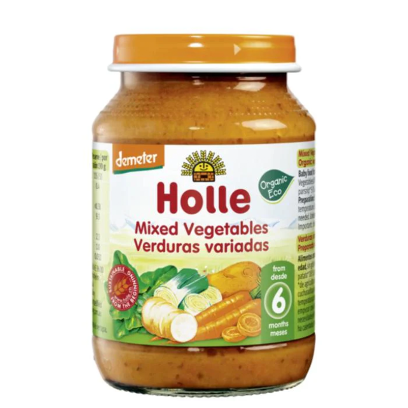 Holle Organic Jar Mixed Vegetables is a finely pureed blend of organic, biodynamic vegetables ideal for introducing wholesome flavours to your baby’s diet in a 190g jar.