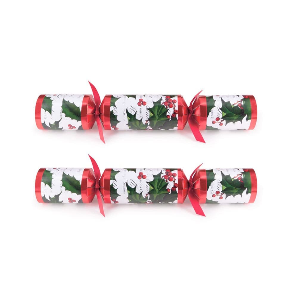 Holly Berry 11” Crackers feature recyclable packaging and reusable festive contents including a hat, snap, joke, and hanging tree decoration. Presented in packs of 50, perfect for professional festive table settings.