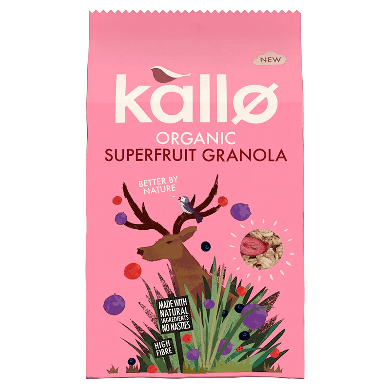 Kallo Organic Superfruit Granola blends crispy oat and wheat flakes with freeze-dried cranberries, blackcurrants, and blueberries. Supplied in 5x360g cartons for reliable kitchen delivery.