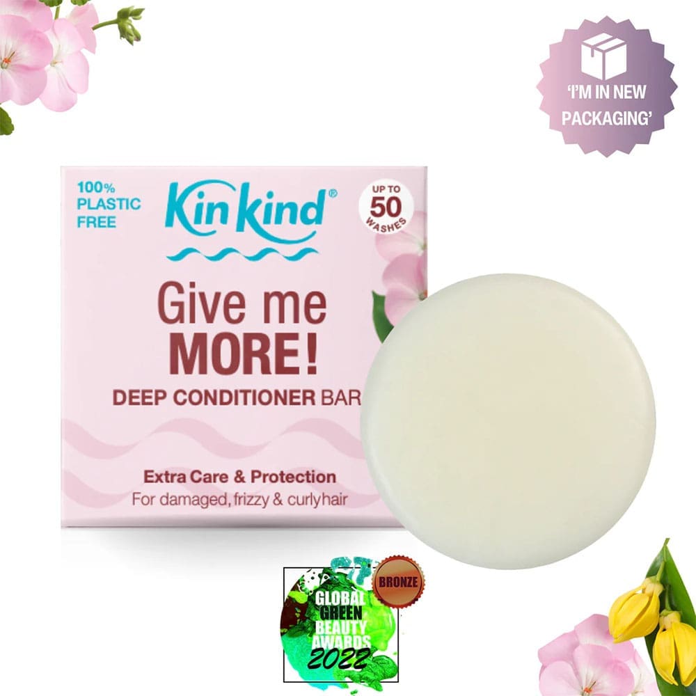 KinKind Give Me More Conditioner Bar deeply nourishes curly and frizzy hair. Use as a leave-in or treatment for soft, manageable curls.