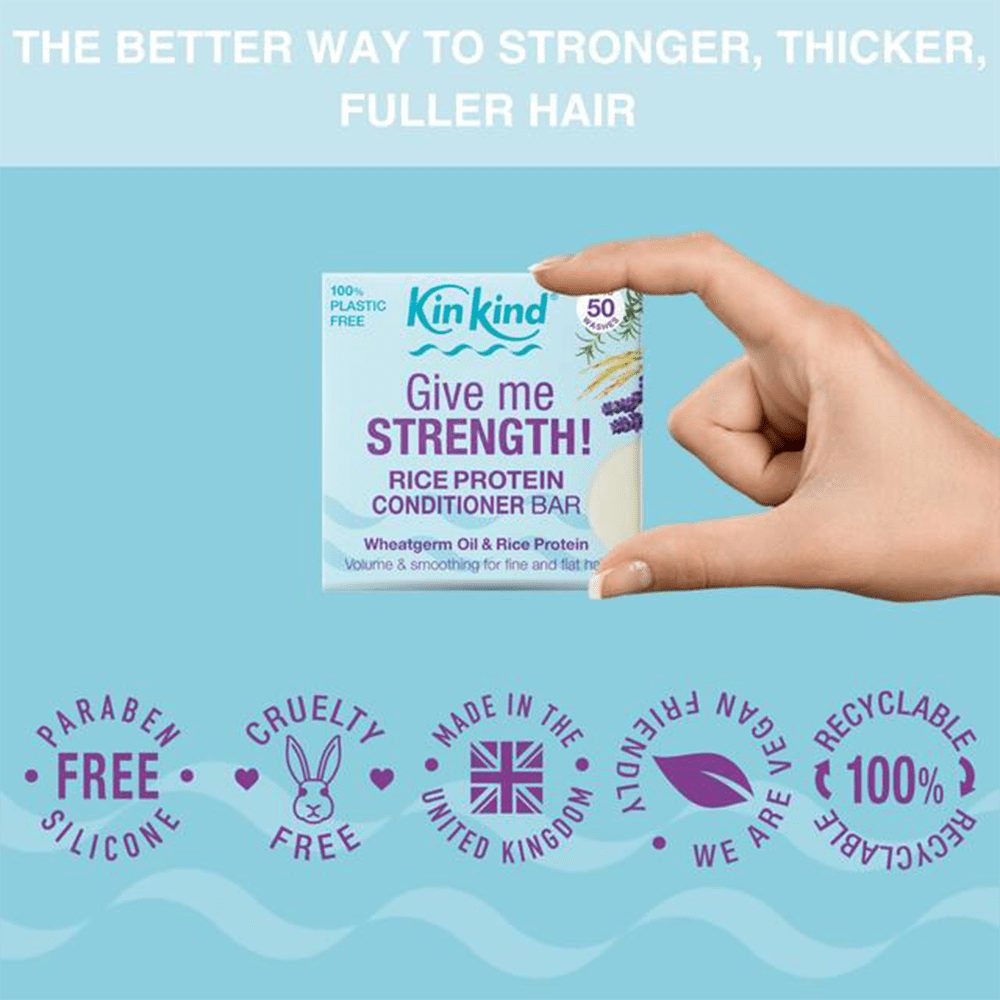 KinKind Give Me Strength Conditioner Bar strengthens fine hair with rice protein and wheatgerm oil, boosting volume and thickness in a 40g solid bar.