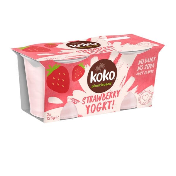 Water, Coconut milk (17%), Strawberries (7%), Sugar, Thickeners (Modified maize starch, pectin, Guar gum), Dextrose, Glucose fructose syrup, Concentrated strawbery juice, Calcium phosphate, Salt, Vitamin D2, Natural flavouring, Vitamin B12, Colour (strawberry concentrate, carotene), Non Dairy live cultures (S. thermophulis, L. bulgaricus).