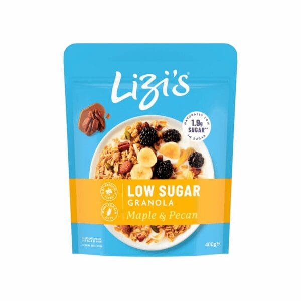 Lizi’s Low Sugar Maple Pecan Granola combines crunchy pecans and natural maple sweetness. Perfect with yogurt for a healthy low sugar breakfast in a 400g pack.