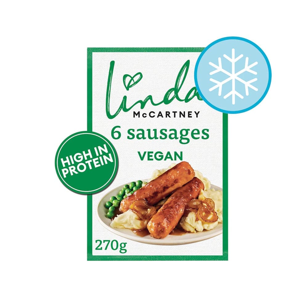 Linda McCartney Vegetarian Sausages, crafted using textured soya protein for authentic flavour. Suitable for grilling, frying or baking. Pack of 8x270g, ideal for kitchen use.