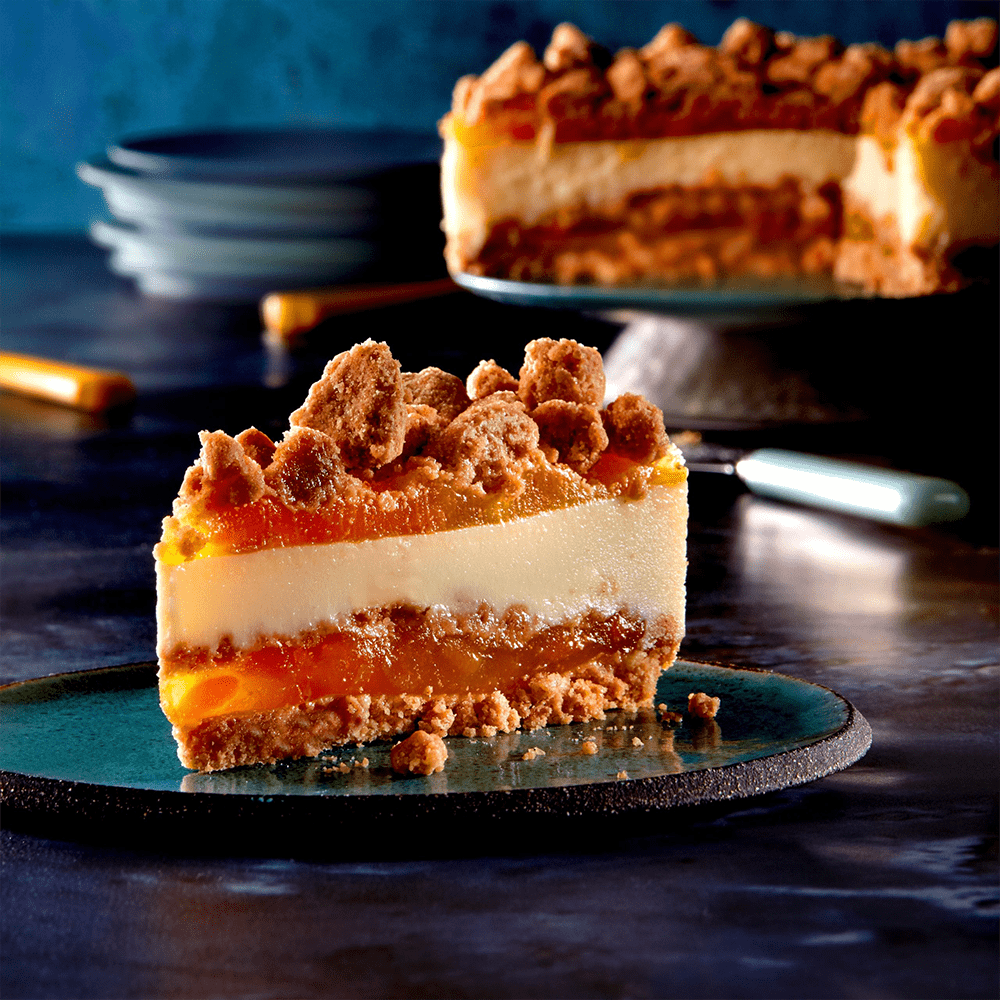Mademoiselle Peach Cobbler Cheesecake combines creamy cheesecake with rich peach cobbler flavours on a speculoos biscuit base. Pre-cut into 14 portions.