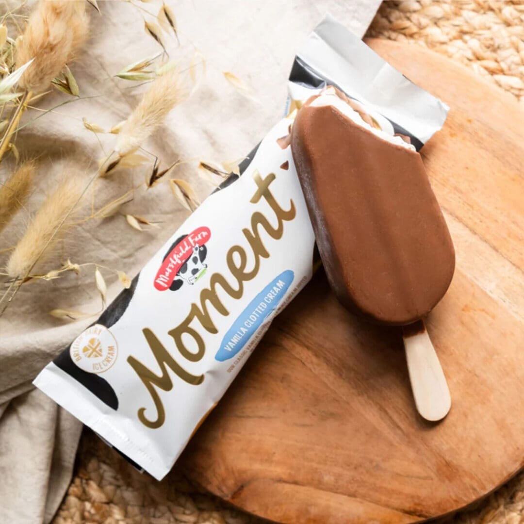 Ice cream (73%) (Fresh whole MILK, Double cream (MILK) (16%), Sugar, ButterMILK powder, Skimmed MILK powder, Clotted cream (MILK) (1.5%), Glucose, Dextrose, Emulsifier: Mono- and diglycerides of fatty acids, Stabilisers: Locust bean gum, Guar gum, Carrageenan, Flavouring, Natural vanilla flavouring, Exhausted vanilla bean powder, Colours: Curcumin, Annatto norbixin.) Milk chocolate coating (27%) (Sugar, Cocoa butter, Whole MILK powder, Cocoa mass, MILK fat, Emulsifier: SOYA lecithins, Natural vanilla flavouring.)