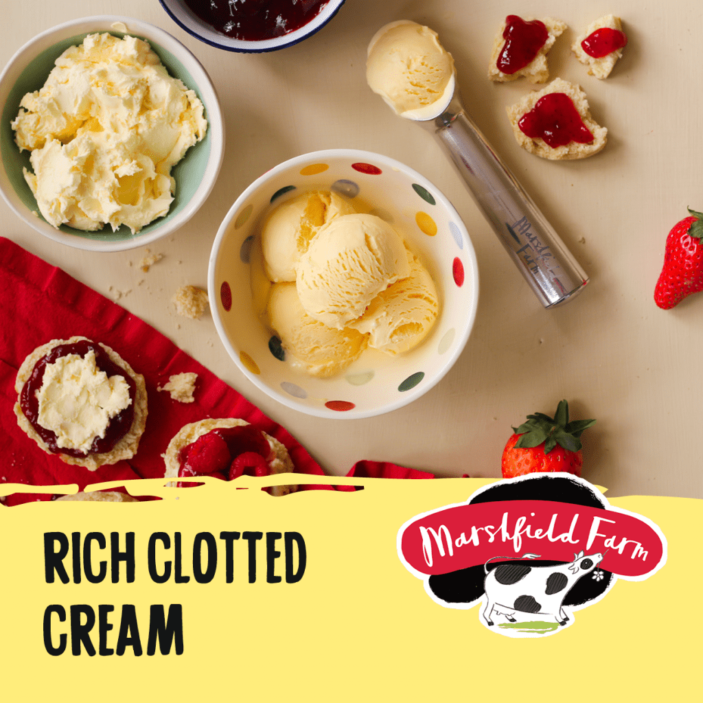 Marshfield Rich Clotted Cream offers authentic dairy richness in 5L tubs, perfect for culinary use. Gluten free, with no palm fats, suitable for vegetarians.