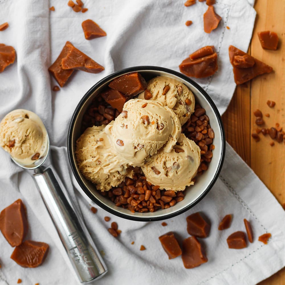 Fresh Whole MILK, Double Cream (MILK) (17%), Sugar, Butterscotch pieces (8%) (Sugar, Glucose Syrup, Vegetable Fats and oils (Shea oil, Sustainable Palm oil and Palm stearin, Emulsifier: Sunflower Lecithin), Butter (MILK), Water, Sweetened Condensed MILK, Salt, Emulsifier: SOYA lecithin, Natural Flavouring, Colour: Plain caramel), Caramel Ripple (6%) (Water, Sugar, Glucose Syrup, Double Cream (MILK), Sweetened Condensed Skimmed MILK, Stabiliser: Waxy Maize Starch, Butter (MILK), Burnt Sugar Syrup, Salt), ButterMILK powder, Glucose, Dextrose, Emulsifier: Mono- and Diglycerides of Fatty Acids, Stabilisers: Locust bean gum, Guar Gum, Carrageenan, Colour: Caramelised sugar syrup, Natural flavouring, Salt (<1%)