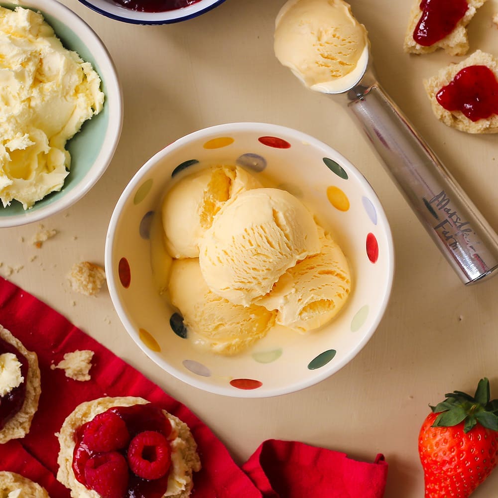Fresh Whole MILK, Double Cream (MILK) (21%), Sugar, ButterMILK Powder, Skimmed MILK Powder, Clotted Cream (MILK) (2%), Glucose, Dextrose, Emulsifier: Mono- and Diglycerides of Fatty Acids, Stabilisers: Locust Bean Gum, Guar Gum, Carrageenan, Flavouring, Natural Vanilla Flavouring (<1%), Exhausted Vanilla Bean Powder (<1%), Colours: Curcumin, Annatto Norbixin.