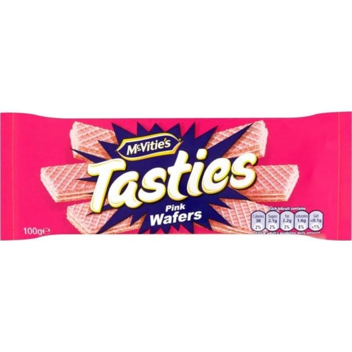McVities Tasties Pink Wafers are crispy pink sandwich wafers with a creamy filling, supplied in 12x100g packs, perfect for cafes or retailers seeking a delicious snack option.