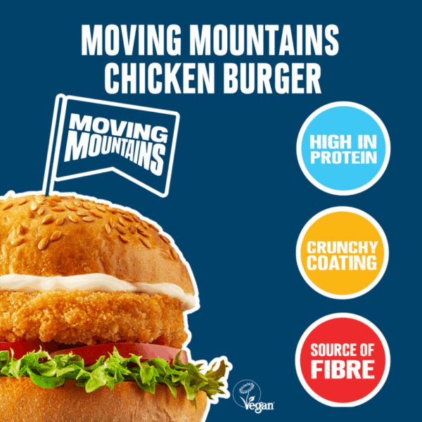 Moving Mountains No Chicken Burger delivers a crunchy, southern-spiced plant-based alternative. Available in 18x125g packs, ideal for diverse menus.