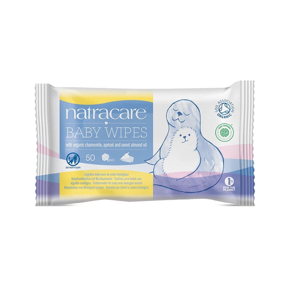Natracare Baby Wipes with organic cotton gently cleanse sensitive baby skin. Ideal for nappy changes and everyday freshness. 50 wipes per pack.
