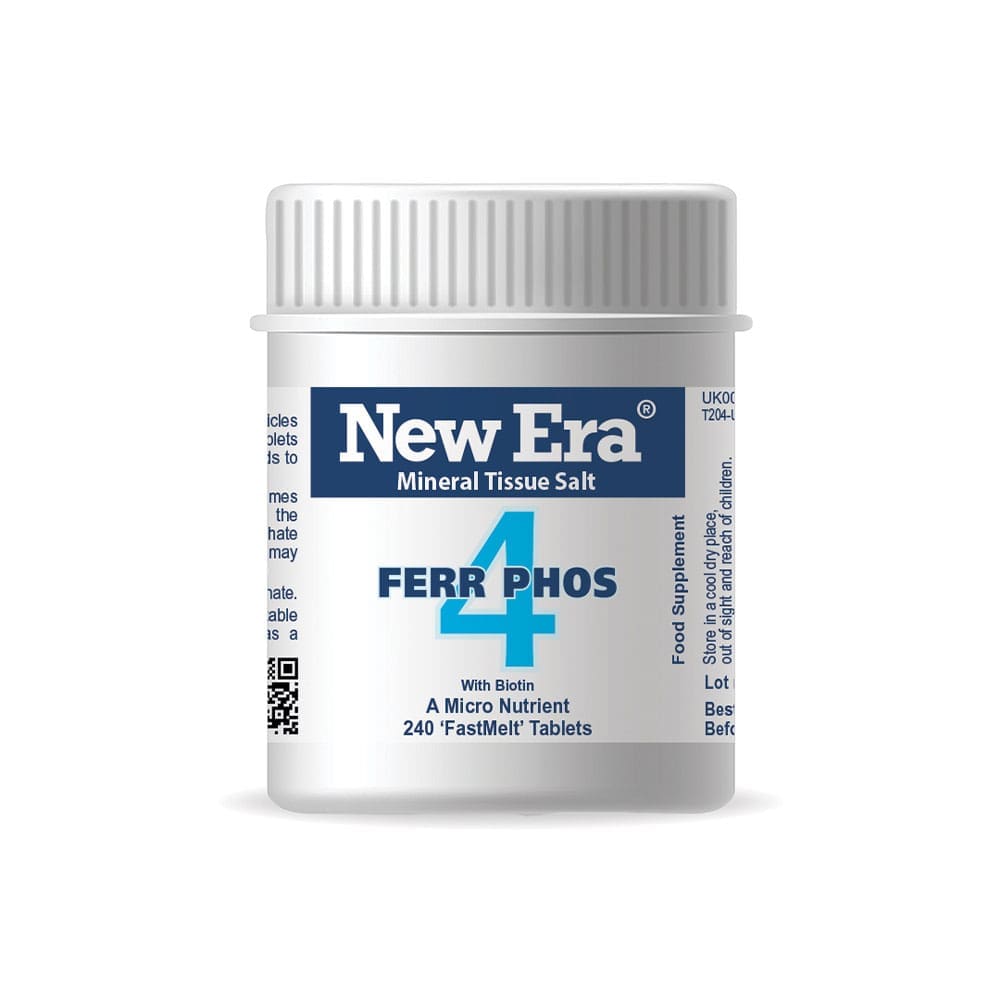New Era No 4 Ferr Phos is a homoeopathic remedy for coughs, chills, and inflammation. Supports natural recovery and blood oxygenation. Supplied in 1x240 units.