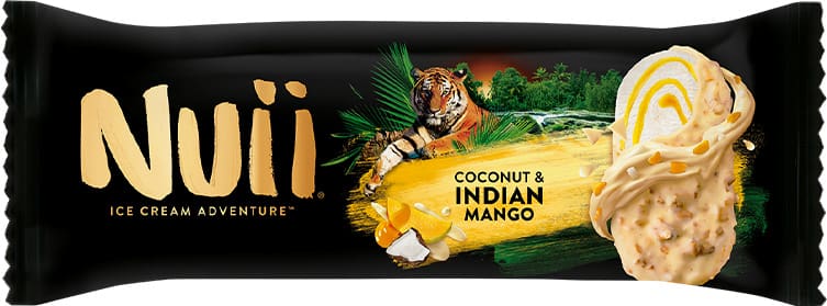 Nuii Coconut & Indian Mango ice cream blends coconut dairy cream with mango and passion fruit sorbet, topped with white chocolate and coconut flakes. Supplied in 20x90ml packs.