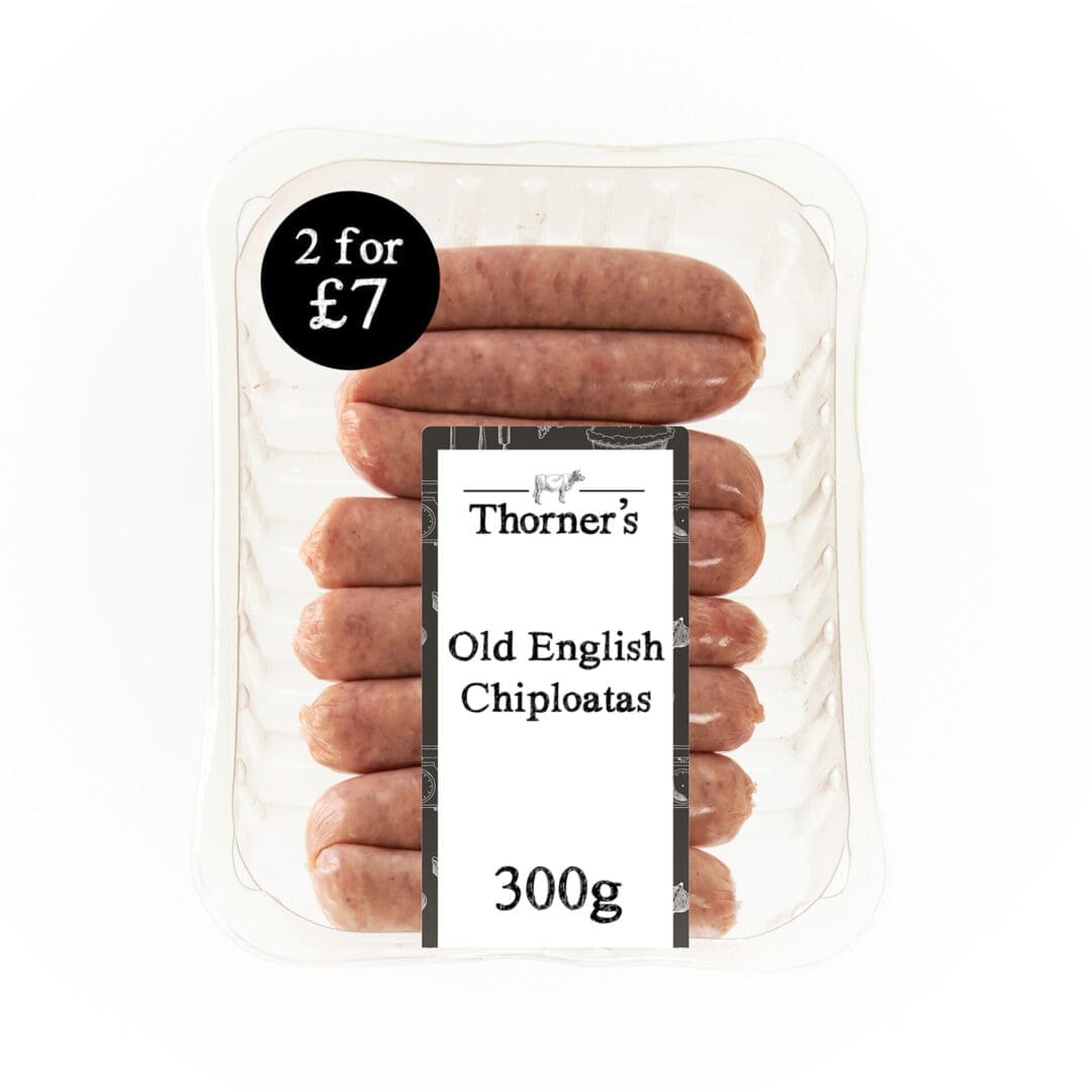 Old English Chipolatas come in 300g packs, delivering traditional British sausage flavour ideal for breakfasts, BBQs, and catering menus.