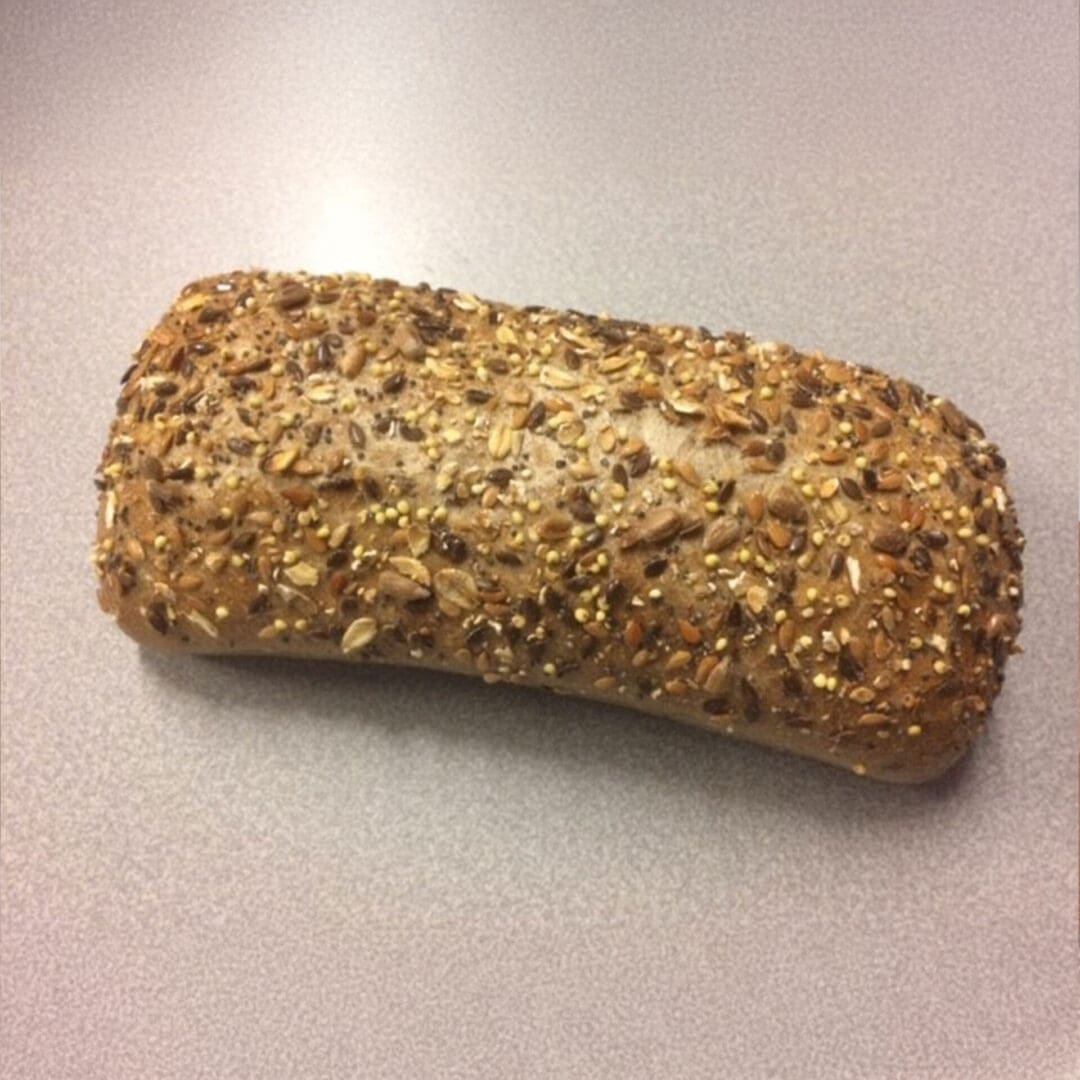 WHEAT flour, water, RYE flour, WHEAT GLUTEN, salt, sunflower seeds, BUCKWHEAT flour, yeast, bran WHEAT, brown linseeds, millet seeds, toasted malted WHEAT flour, yellow linseeds, OAT flakes, rice flour, BARLEY flour, malted WHEAT flour, flour treatment agent : E300, enzymes. Topping : OAT flakes, brown linseeds, yellow linseeds, sunflower seeds, millet seeds, poppy seeds.