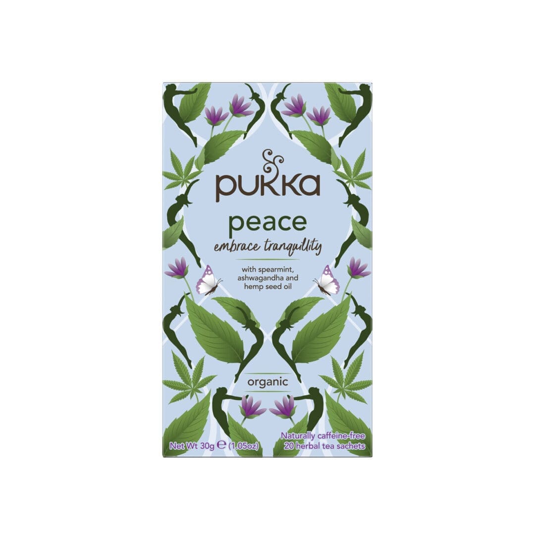 Pukka Organic Peace Herbal Tea is a calming, certified organic blend available in 4x20 sachets. Perfect for servings promoting relaxation.