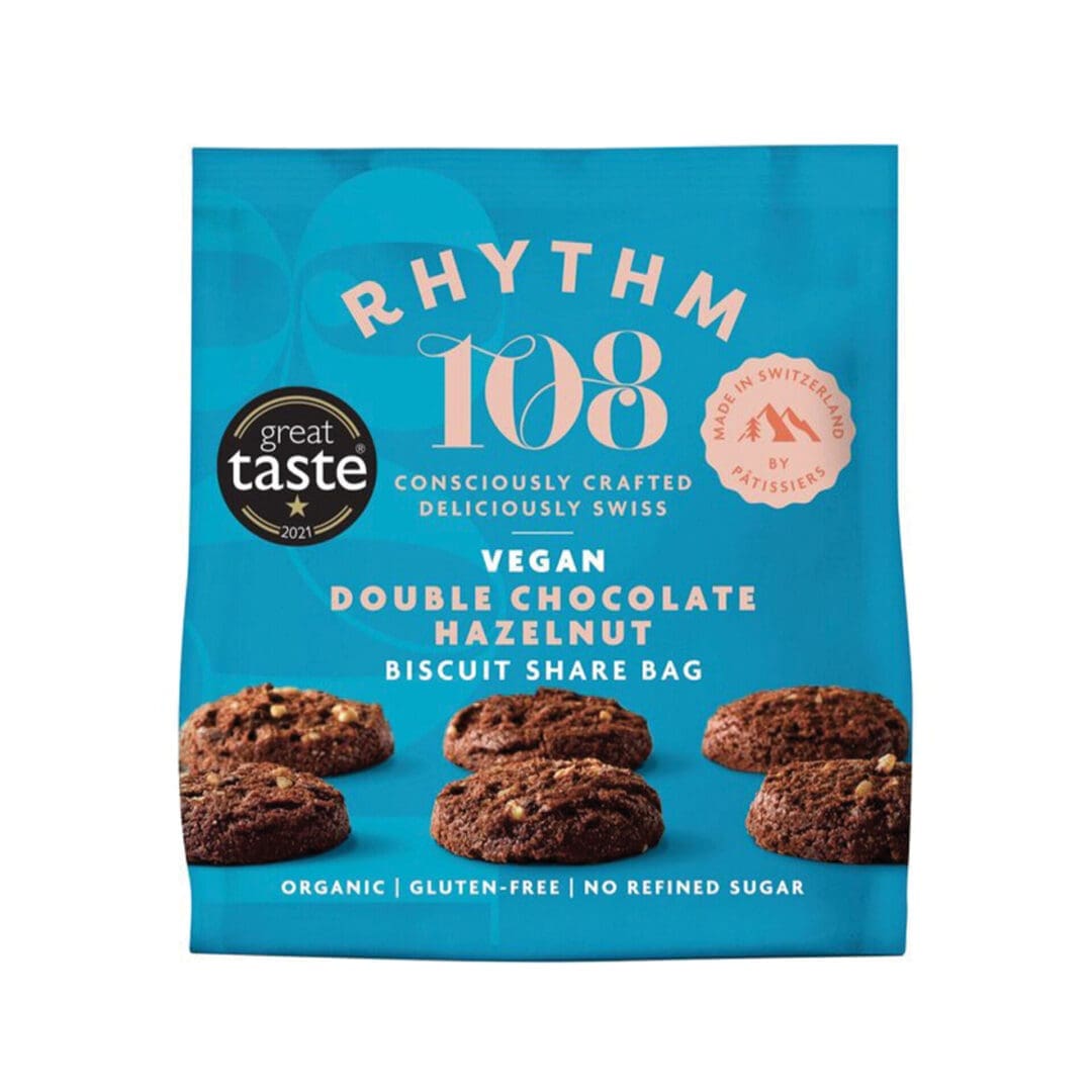 Rhythm 108 Organic Double Choc Hazelnut Share Bag features rich organic chocolate with crunchy hazelnuts in convenient 8x135g packs. Ideal for sharing.