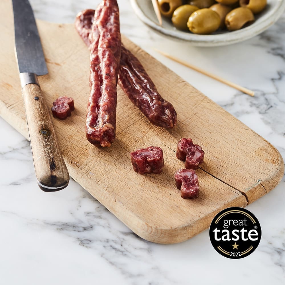 Rosette Salami crafted from free-range pork, seasoned with garlic and a unique spice blend, encased in natural hog casings. Ideal for deli boards and sandwiches. Packaged 1x400g.