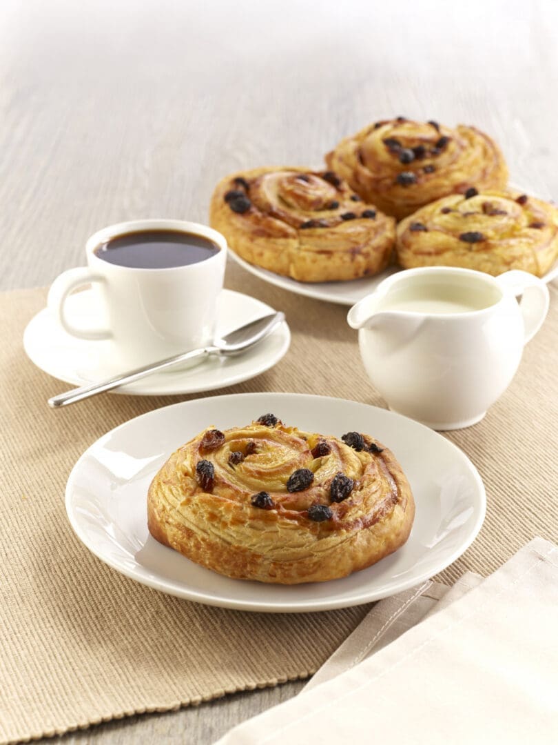 Schulstad Pain Raisin combines buttery croissant dough with creme patissiere and raisins. Perfectly portioned at 105g each, ideal for freshly baked pastries.