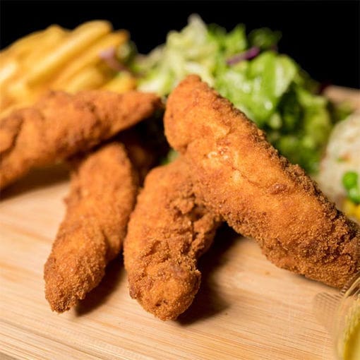 Chicken inner fillet (62%), Water, Tapioca starch, Salt, Modified Tapioca Starch, WHEAT GLUTEN, WHEAT Flour, Onion Powder, Natural Flavour, Garlic powder, Spices (White Pepper, Black Pepper, Garlic, Onion, CELERY, Oregano, Fennel), Yeast extract, Leavening (Sodium Acid Pyrophosphate, sodium bicarbonate), Yellow corn flour, WHEAT Starch, Dry yeast, Sugar, Paprika extract, Turmeric extract, Fully Refined Soybean Oil.