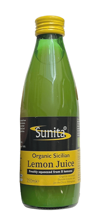 Sunita Organic Lemon Juice is freshly squeezed from organic lemons, delivering natural flavour in a convenient 250ml bottle, perfect for culinary use.