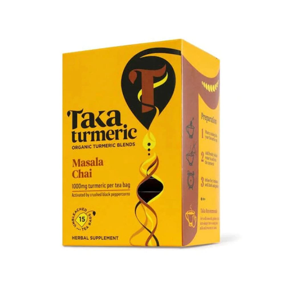 Taka Organic Masala Chai Turmeric Tea contains 15 bags of golden spiced organic blend. Perfect served with milk for a warming, aromatic beverage.