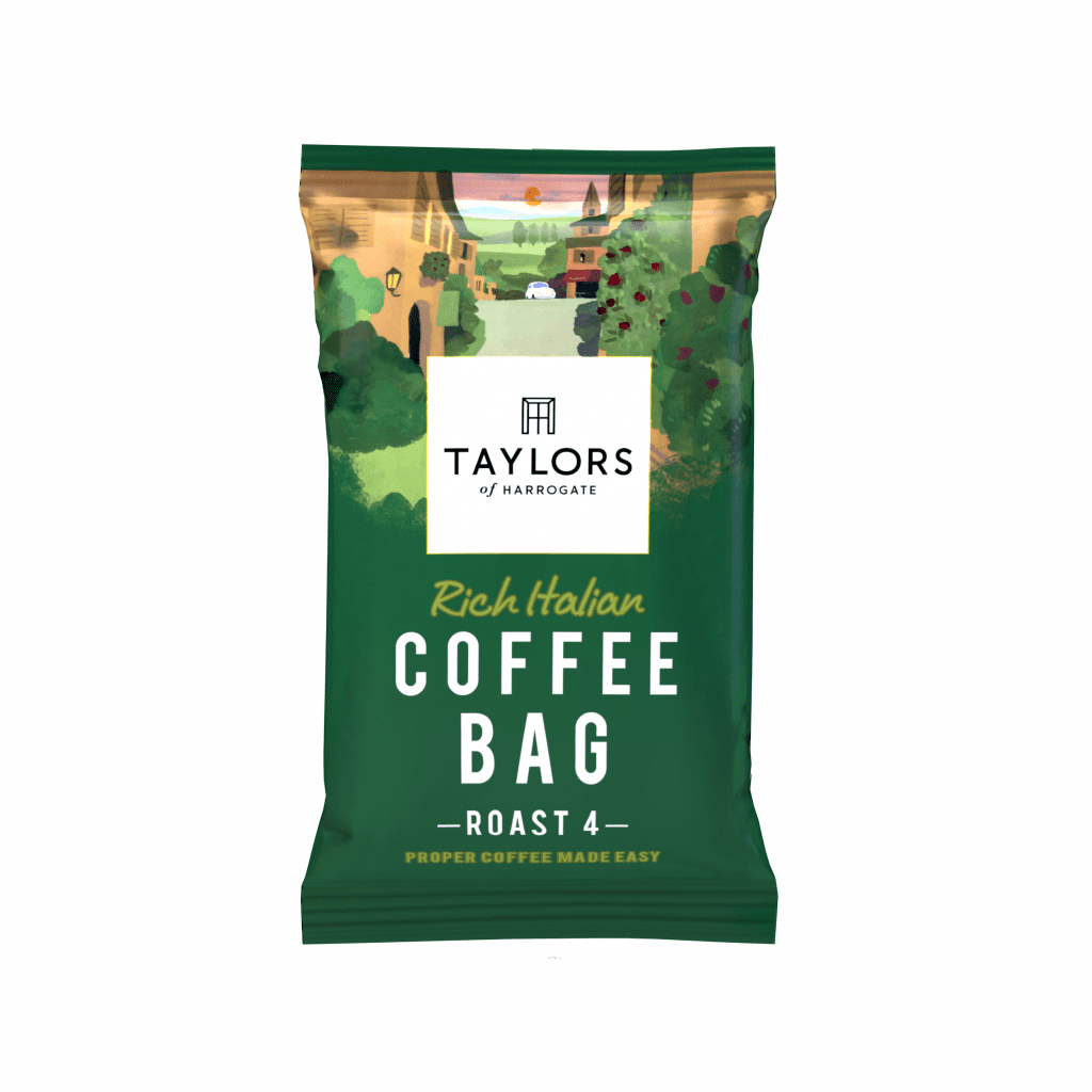 Taylors Italian Coffee Bags blend rich Arabica coffee with hints of chocolate and almonds. Easy to brew for a smooth, mess-free coffee experience.