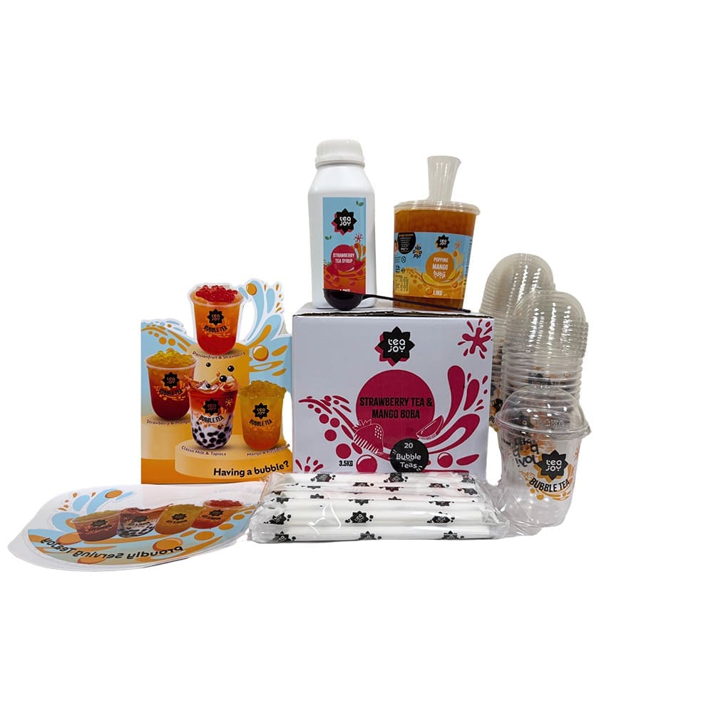 Tea Joy Strawberry Tea Kit delivers a complete bubble tea experience, including strawberry syrup, mango boba, cups, lids, straws, and a training manual for 20 servings. Ideal for professional use.