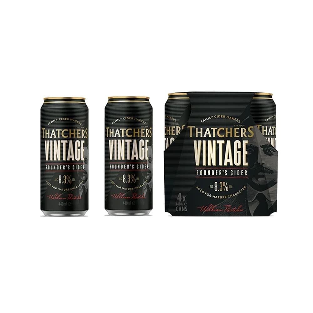 Thatchers Vintage Cans offer a rich, medium dry 8.3% cider, crafted with four generations of expertise. Available in 24x440ml cans, ideal for discerning buyers seeking quality cider.