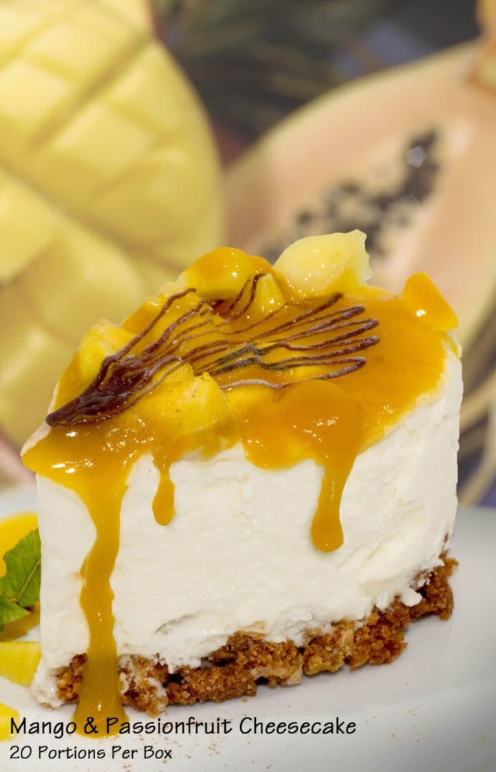 Enjoy the Vanier Mango and Passionfruit Cheesecake, a creamy individual dessert with tropical flavours. Perfect served chilled, ideal for cafes and menu variety.