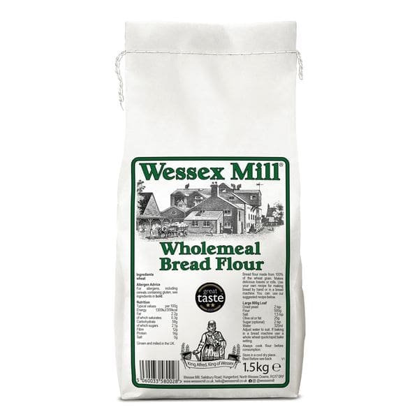 Wessex Mill Wholemeal Bread Flour 5×1.5kg delivers quality wholegrain flour, perfect for hearty bread baking in professional bakeries and kitchens.