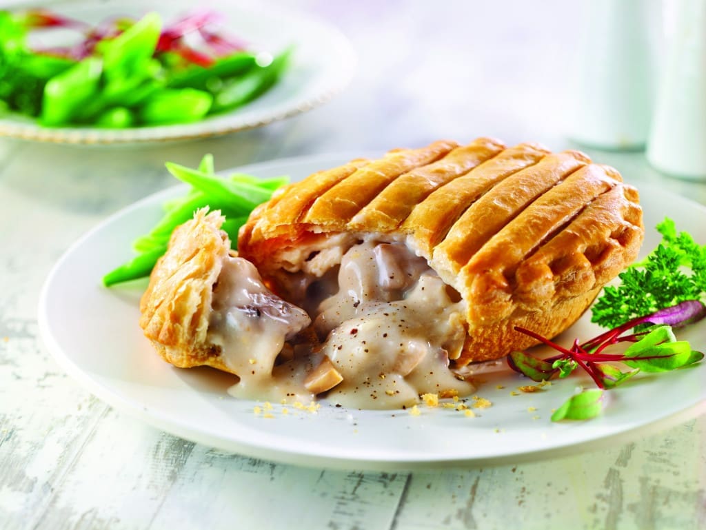 Water, WHEAT Flour, Cooked Chicken (13%) (Chicken, Salt), Margarine [Palm Oil, Palm Stearin, Water, Salt, Rapeseed Oil, Emulsifier (E471), Acidity Regulator (E330), Lemon Juice concentrate], Vegetable Shortening (Palm Oil, Rapeseed Oil, Palm Stearin), Mushrooms (3%), Fat Powder [Palm Fat, Lactose (MILK), MILK Solids], Chicken & Mushroom Sauce Powder [Thickener (E1422), Fat Powder (Palm Oil, Lactose (MILK), MILK Protein), Salt, WHEAT Flour, Whole MILK Powder, Flavour Enhancer (E621), Hydrolysed Vegetable Protein, Yeast Extract, Flavourings (contains CELERY)], Thickener (E1422), Glaze [Water, Modified Starch (Potato, Tapioca), Rapeseed Oil, MILK Proteins, Emulsifiers (SOYA Lecithin, E471), Acidity Regulator (E339iii), Colour (E160a)], Roast Chicken Stock [Roast Chicken, Chicken Fat, Yeast Extract, Glucose Syrup, Maltodextrin, Natural Flavouring, Salt, Sugar, Concentrated Chicken Extract, Lemon Juice Concentrate, Dried Onion], Salt, Raising Agents (E450, E500), Black Pepper.